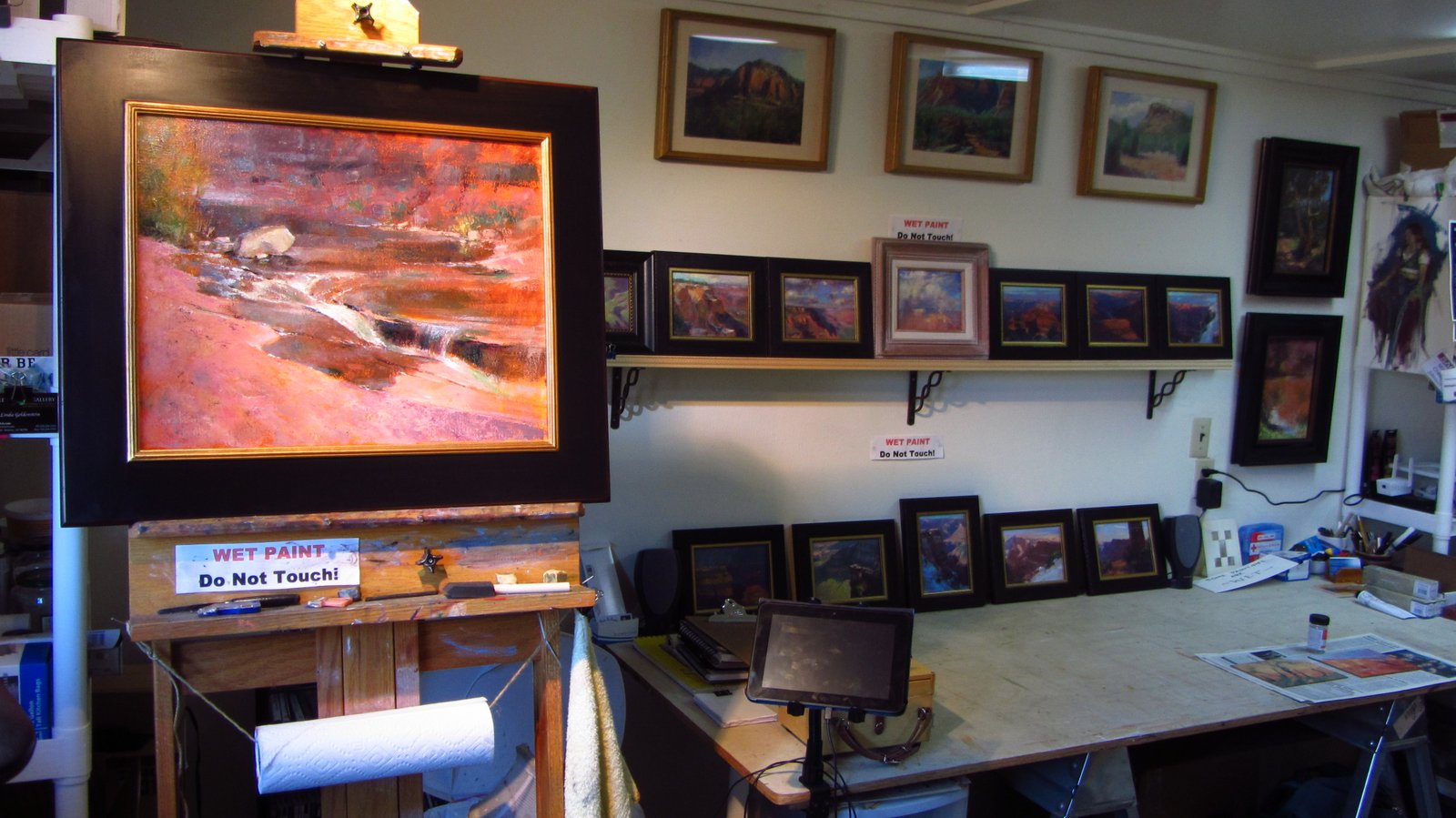 In the gallery, you can purchase both framed and unframed pieces, and finished gallery paintings as well as sketches and demonstrations. Michael works in oil and pastel, in sizes ranging from 5"x7" up to 48"x48". Subject matter includes local scenery as well as vistas of the Grand Canyon, landscapes of New Mexico, Colorado, Utah and Arizona; and a few maritime scenes.